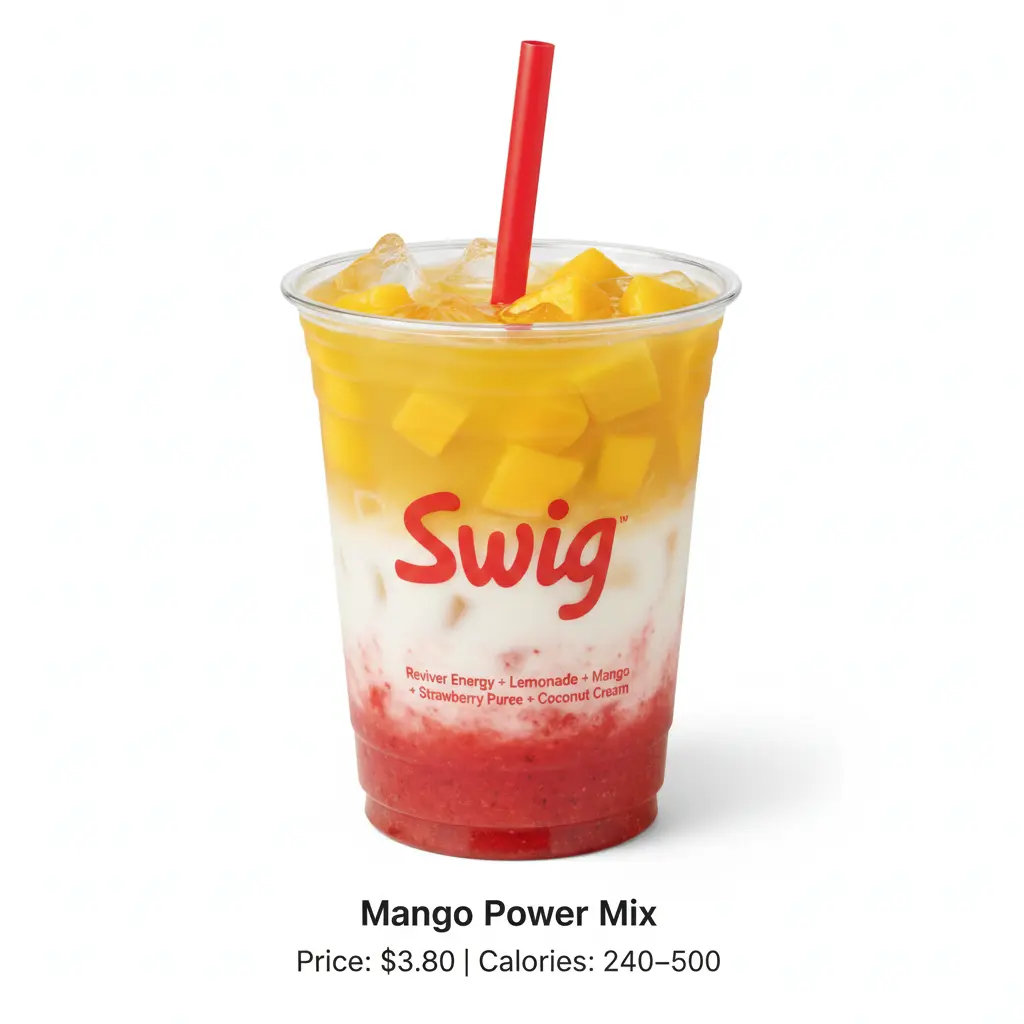 Swig Refresher is famous because it is a light-weight and fruit drink that is mixed with refreshing fruit flavors. It gives a light energy boost while tasting fresh, sweet, and easy to drink.