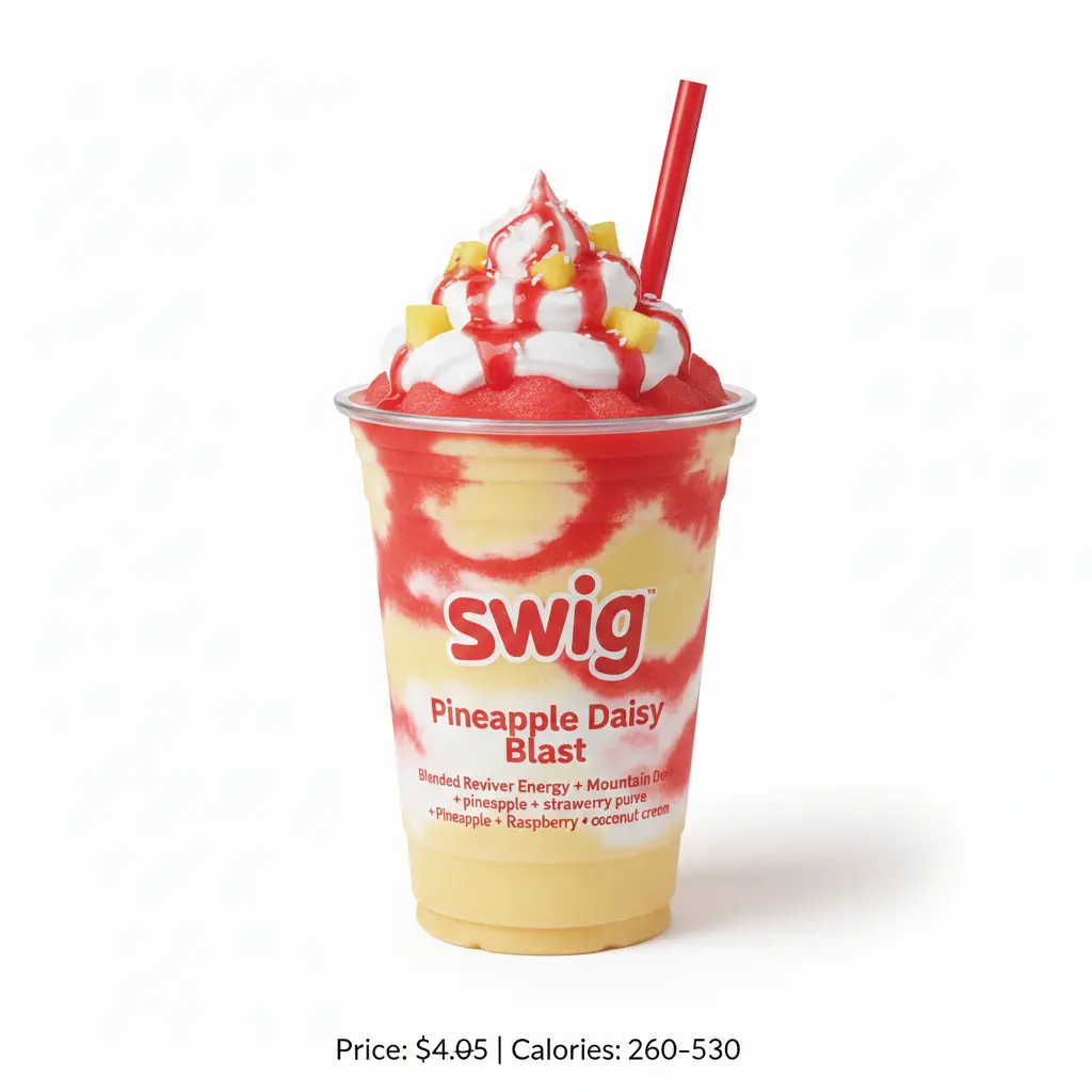 Blended Reviver Energy + Mountain Dew + pineapple + strawberry + coconut cream Price: $3.49 | Calories: 390–760